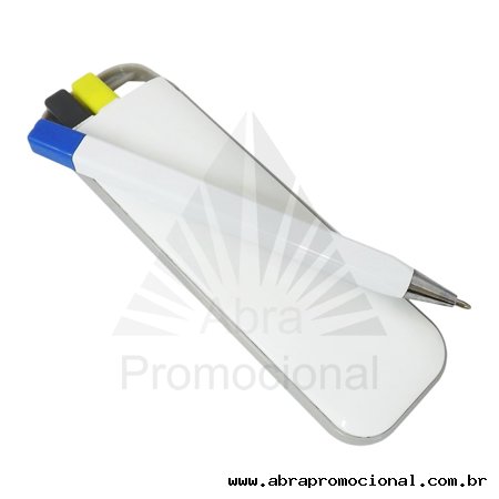 Kit 3 em 1 branco em plástico resistente. Possui: caneta/carga azul, marca texto amarelo e lapiseira. Lateral e trava(ba