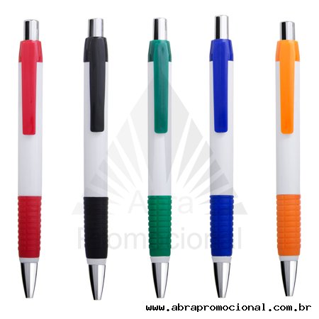 Caneta plástica branca com detalhes coloridos. Possui clip plástico colorido, possui anel central prata e parte inferior emborrachada colorida com relevo . Aciona por clique.